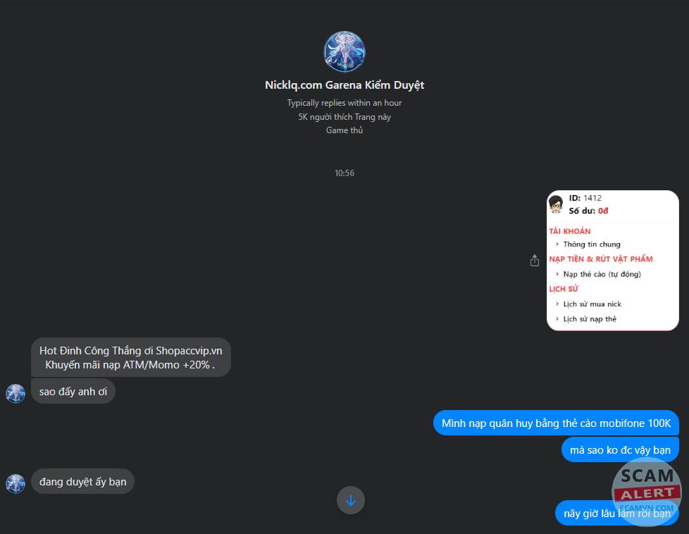 #Bằng chứng/dấu hiệu 1   300.000 VNĐ   Giao dịch nạp quân huy cho game Liên quân Mobile nhưng không thực hiện